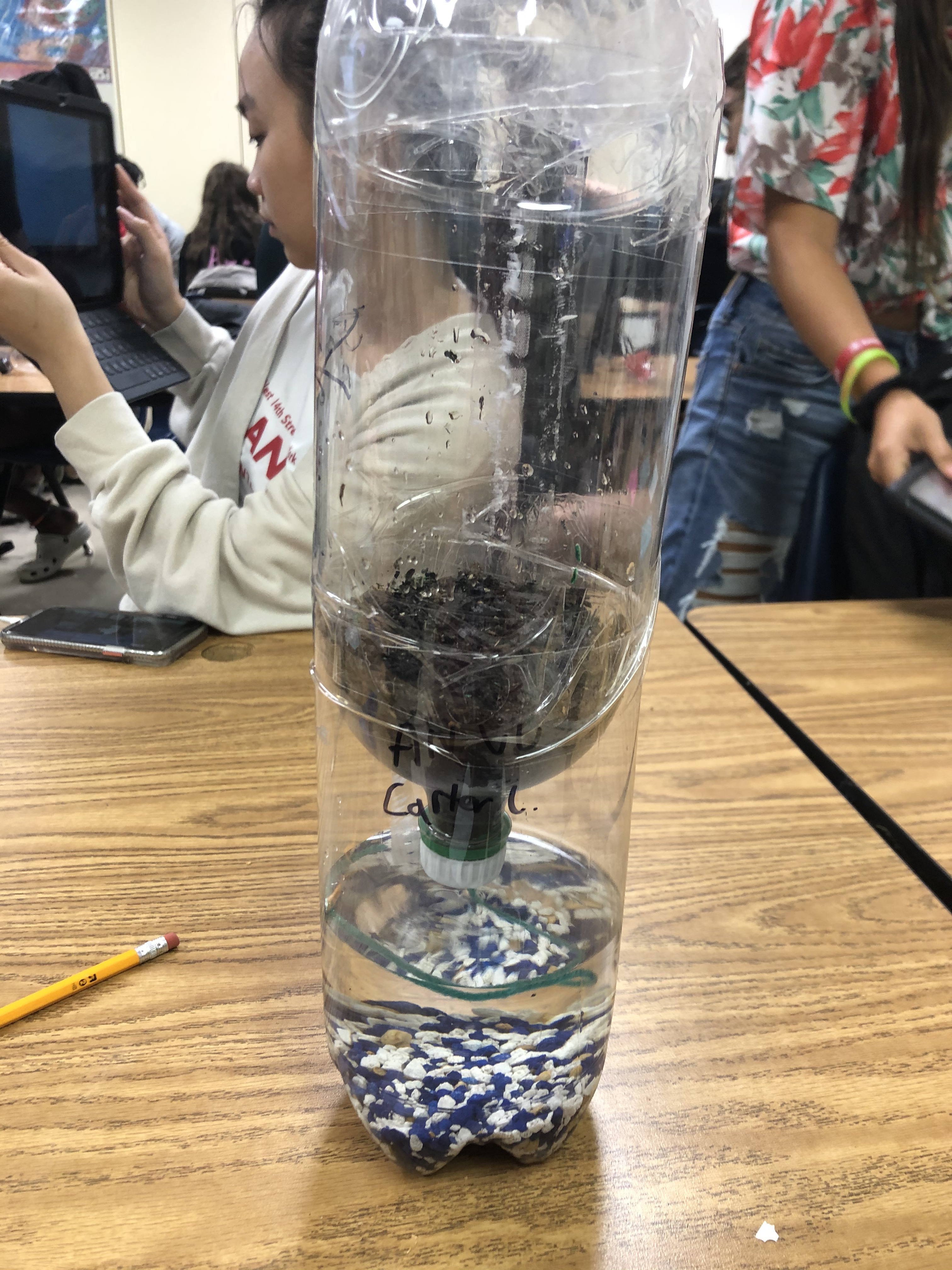 Today we set up our bottle biome. This allows us to observe an ecosystem grow. We built it by cutting 2 bottles, one at the top one at the bottom, and put the top end top-down in the bottom bottle. We then sealed it with the bottom we cut out. We fed a string through the cap into a pool of water so that it will water the soil through cohesion and adhesion. We sprinkled seeds over the soil and we will watch them grow.